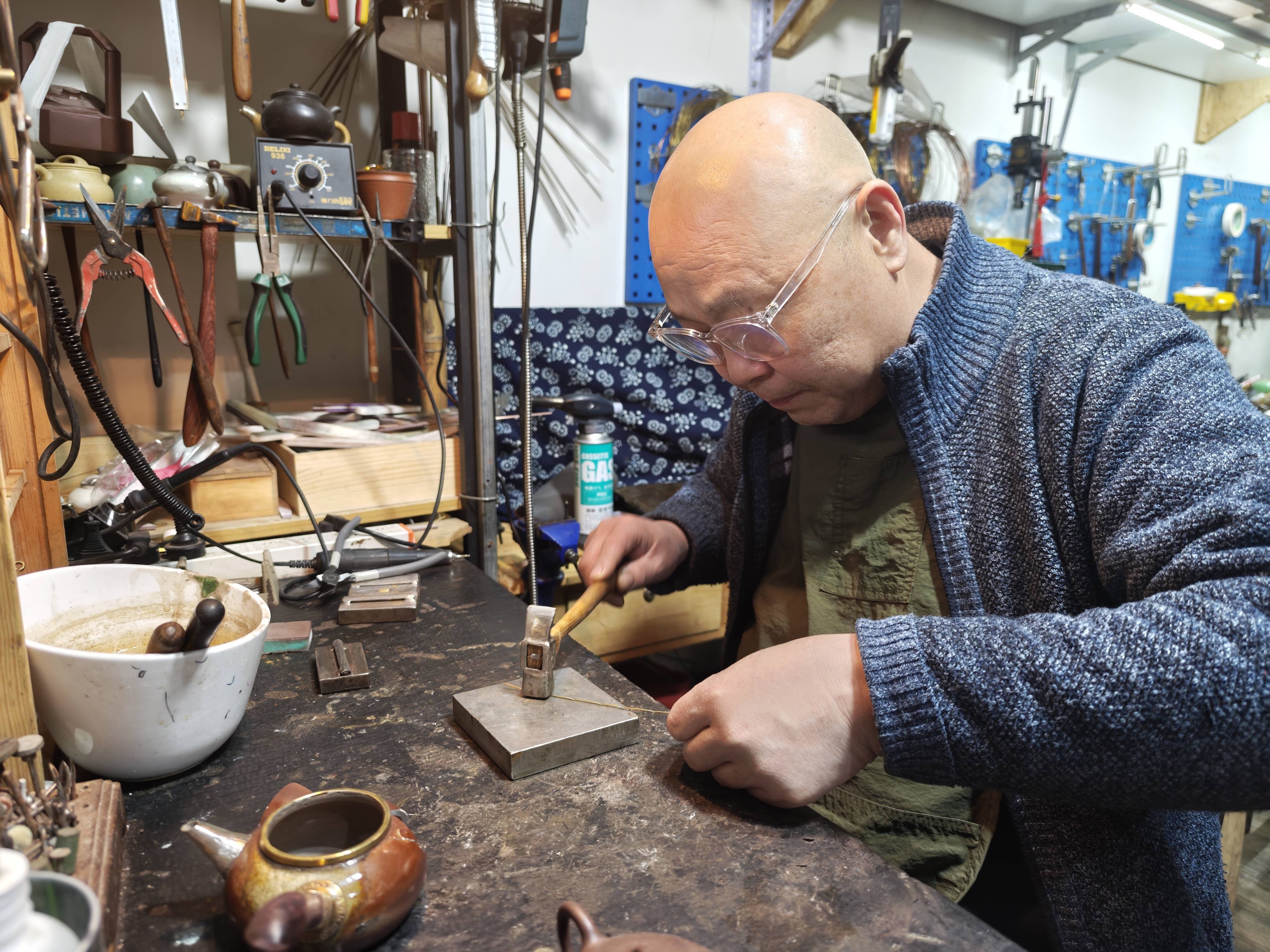 杨涛最近正在修复两把碎裂的茶壶。他将茶壶摆在工作台前,仔细端量,这个过程往往会持续很久。当脑中灵光闪现,他便毫不犹豫地拿起锤子,几番锤砸,传统的锔钉便化为远处飞鸿、一缕祥云或是一蔓枝叶,覆盖裂缝,并使碎裂处与器皿浑然一体。在他手里,原本残缺的器物变成珍贵的艺术品。