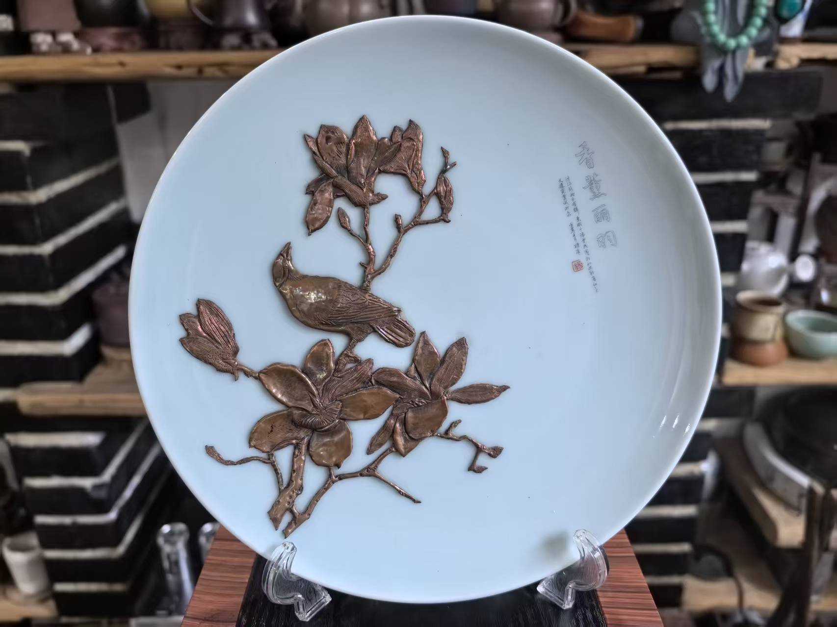 杨涛大胆提出了“装饰性锔瓷”的概念。他不再单纯地修补裂痕,而是利用金、银、铜等贵金属,在残瓷甚至完整的瓷器上进行二次创作,金属在他手中化作枝头蜡梅、人物肖像或古朴山水,镶嵌在瓷器上,完成艺术的再造。