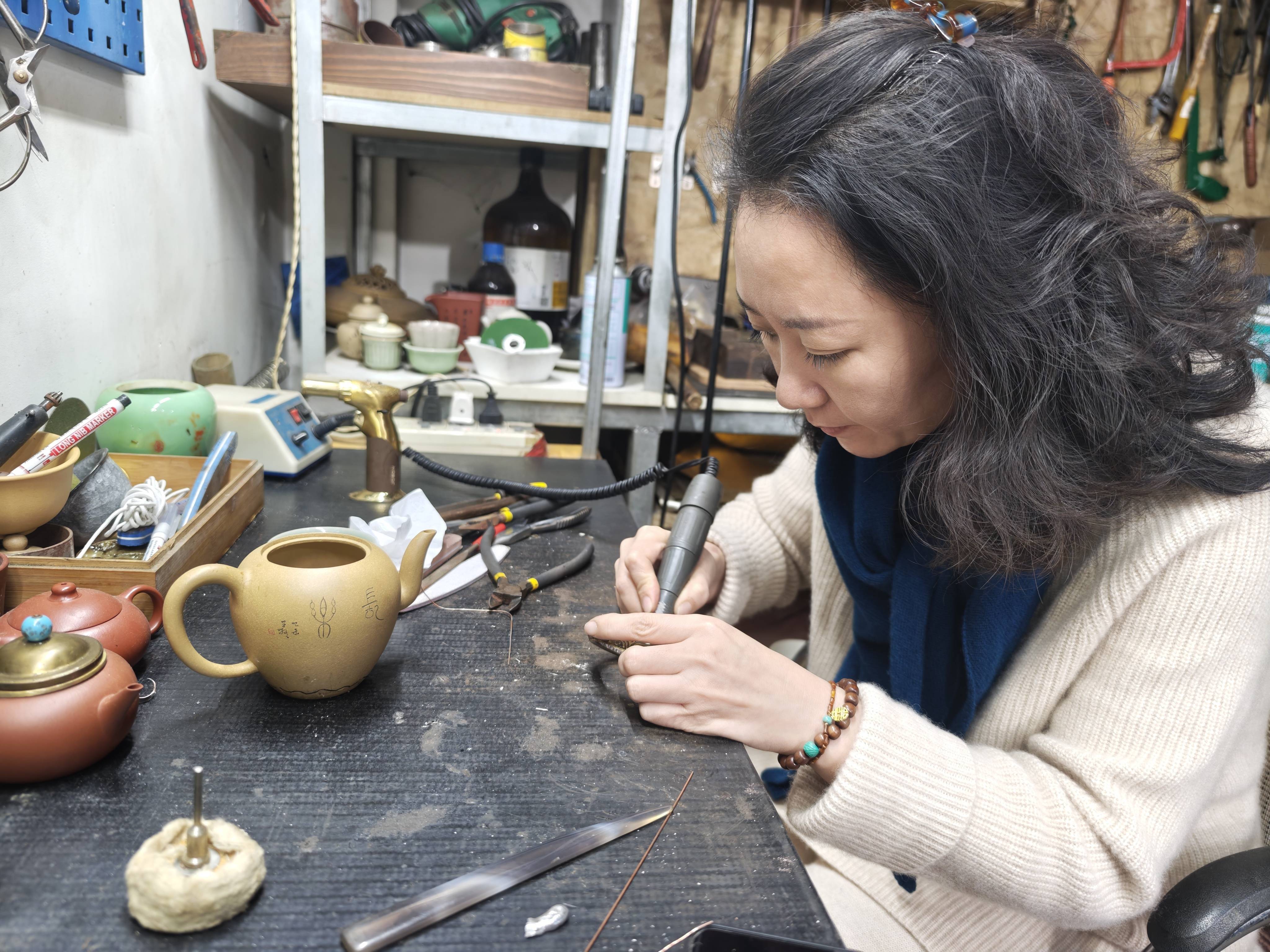 王晓梅正在打磨用于锔瓷的底座。新华社记者 张昕怡 摄在锔合居,徒弟王晓梅正在修复一件底部开裂的茶壶。她为这把壶设计了莲花形的黄铜底座,低调的铜色与古朴的壶身相得益彰。“修复残缺器物的过程很治愈。”她说。从事室内设计的她,想通过学习这门传统技艺,为现代设计的创作和应用带来更多可能。