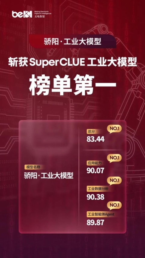 智能体平台的构建高度依托高质量大模型能力。北电数智在大模型领域持续深耕布局,打造出多款性能卓越的模型产品。其中,面向工业领域研发的“骄阳 工业大模型”表现尤为亮眼。在近期国内权威第三方评测机构SuperCLUE发布的中文原生工业大模型测评基准SC-Industry最新榜单中,以83.44的总分斩获综合排名第一,并在“应用能力”维度和“工业数据分析”及“工业智能体Agent”两大核心子项能力上均位居榜首。该模型凭借强大的工业文档问答、精准深入的数据分析,以及智能灵活的工业智能体协同能力,为制造业“研、产、供、销、服”全流程智能化升级注入强劲动能。