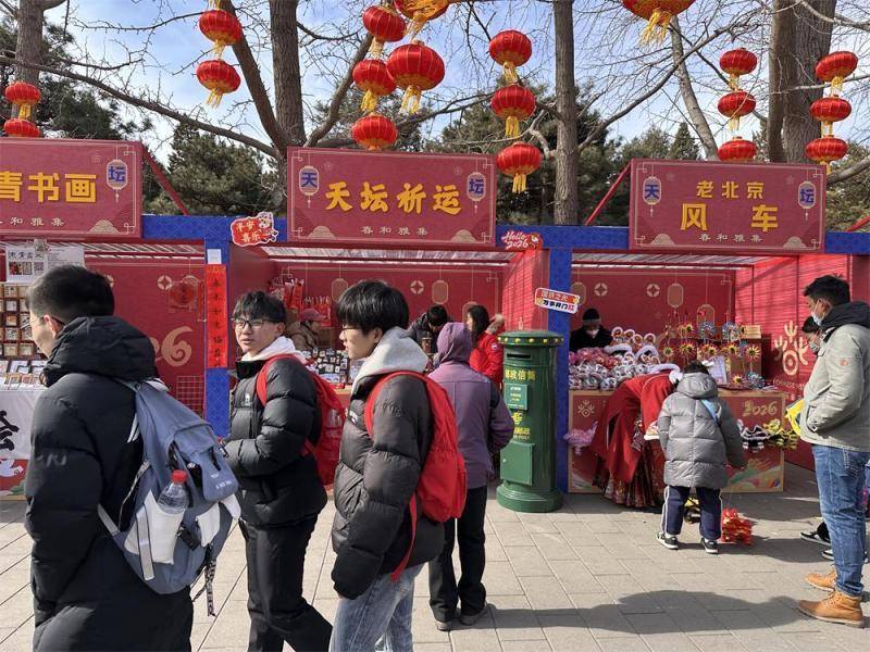 天坛公园 “春和雅集” 文化市集与 “天坛创意” 文创市集双线联动,以非遗手作与国潮文创为核心,为游客打造沉浸式新春消费新场景。限量5000张的祈年殿造型明信片融合工笔重彩与水彩云纹,一上市便成为打卡爆款。“福”字包挂、“马载鸿福”冰箱贴等新品将祈年殿色彩与生肖文化巧妙结合,让祈福融入日常。奥运主题邮局临时服务点,购物满额提供免费生肖邮票与寄信服务,游客写下期许投递邮筒,让祝福飞向远方。来自天津的游客李女士手持明信片与祈年殿同框打卡:“既能亲手体验非遗技艺,又能带走有文化底蕴的国潮好物,这样的年味特别有意义。”