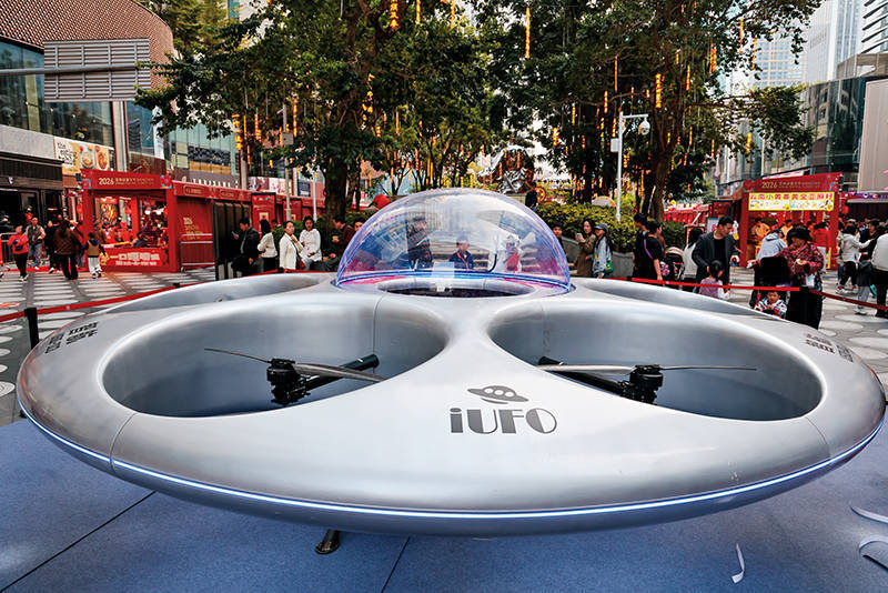 人们在深圳市福田区的节日广场花市观看飞碟形状的载人电动垂直起降飞行器(2026 年 2 月 10 日摄) 梁旭摄 / 本刊发挥研发和制造支撑作用