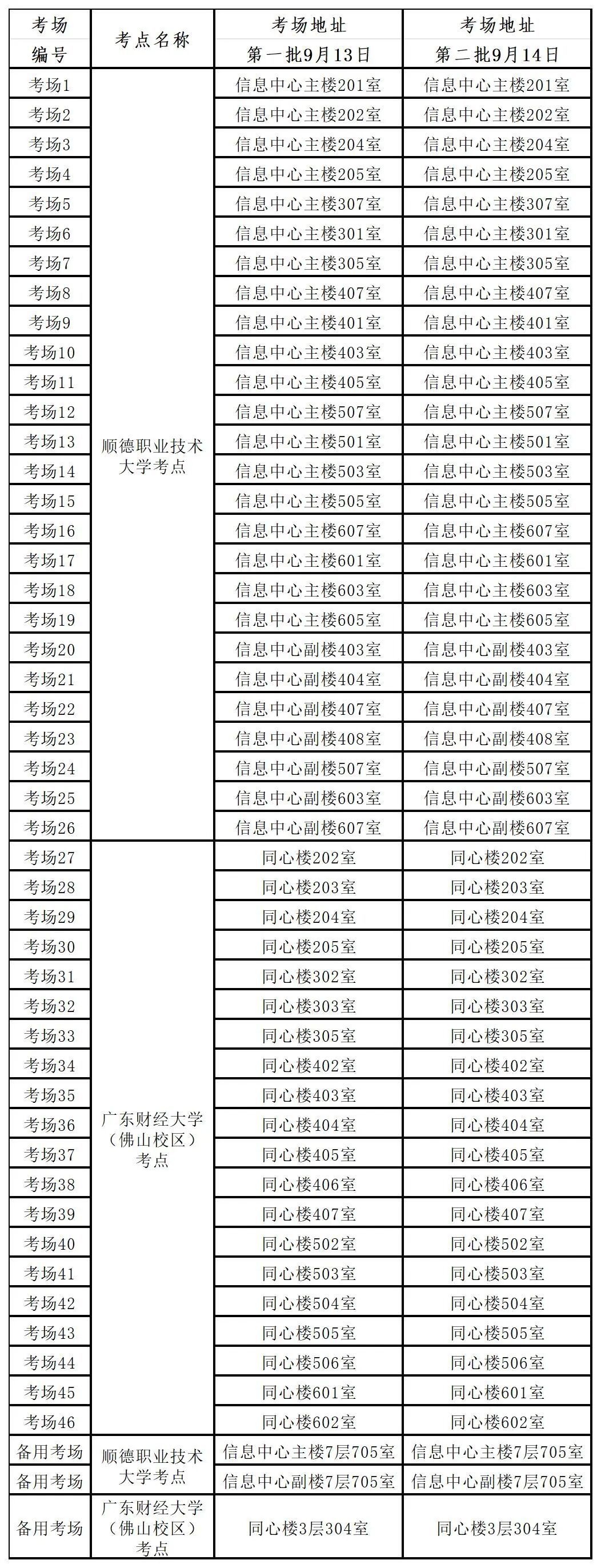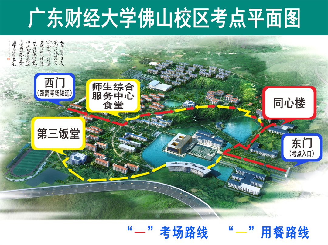广东省佛山市三水区云东海街道学海中路1号。建议考生尽量选择从考点东门进入,因考点西门距离考场相对较远(步行时间需20分钟左右),如选择从西门进入,请预留充足时间。