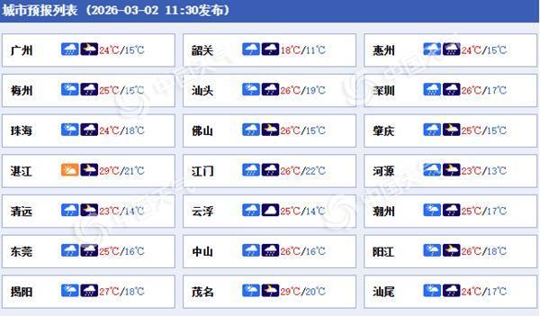 广东各城市天气预报。