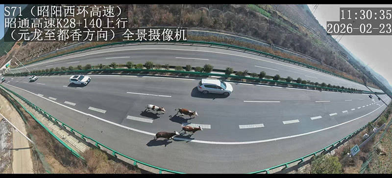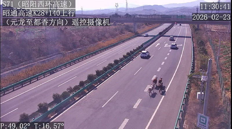 2月23日11时30分许,正值正月初七春运返程高峰,在云南省昭通市S71昭阳西环高速公路出现惊险一幕:一辆载有7头牛的轻型仓栅式货车因车门插销松动,导致受惊的牛群跳车,在疾驰的车流中乱窜,过往车辆纷纷紧急避让,现场险象环生。