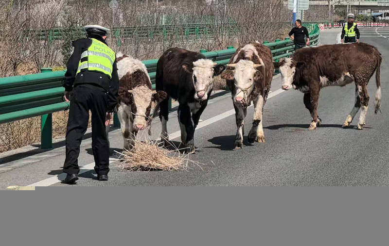 随后,民警在距离事发点约600米处找到了仍在奔跑的4头牛。为了安抚极度惊恐的牛群,民警化身“临时牛倌”,一边小心翼翼地靠近,一边拔来路边的草进行喂食,试图稳定牛的情绪。同时,现场紧急协调高速公路运营部门,拆开一段波形护栏,为牛群开辟出一条绿色通道。