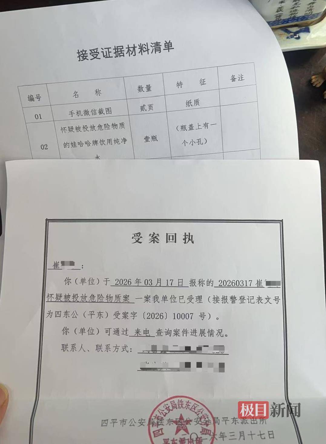 3月17日,崔先生到当地平东派出所报案并做笔录。崔先生提供的受案回执显示,他怀疑被投放危险物质案已被受理。崔先生称,他还提供了一瓶未被打开的纯净水作为证据。