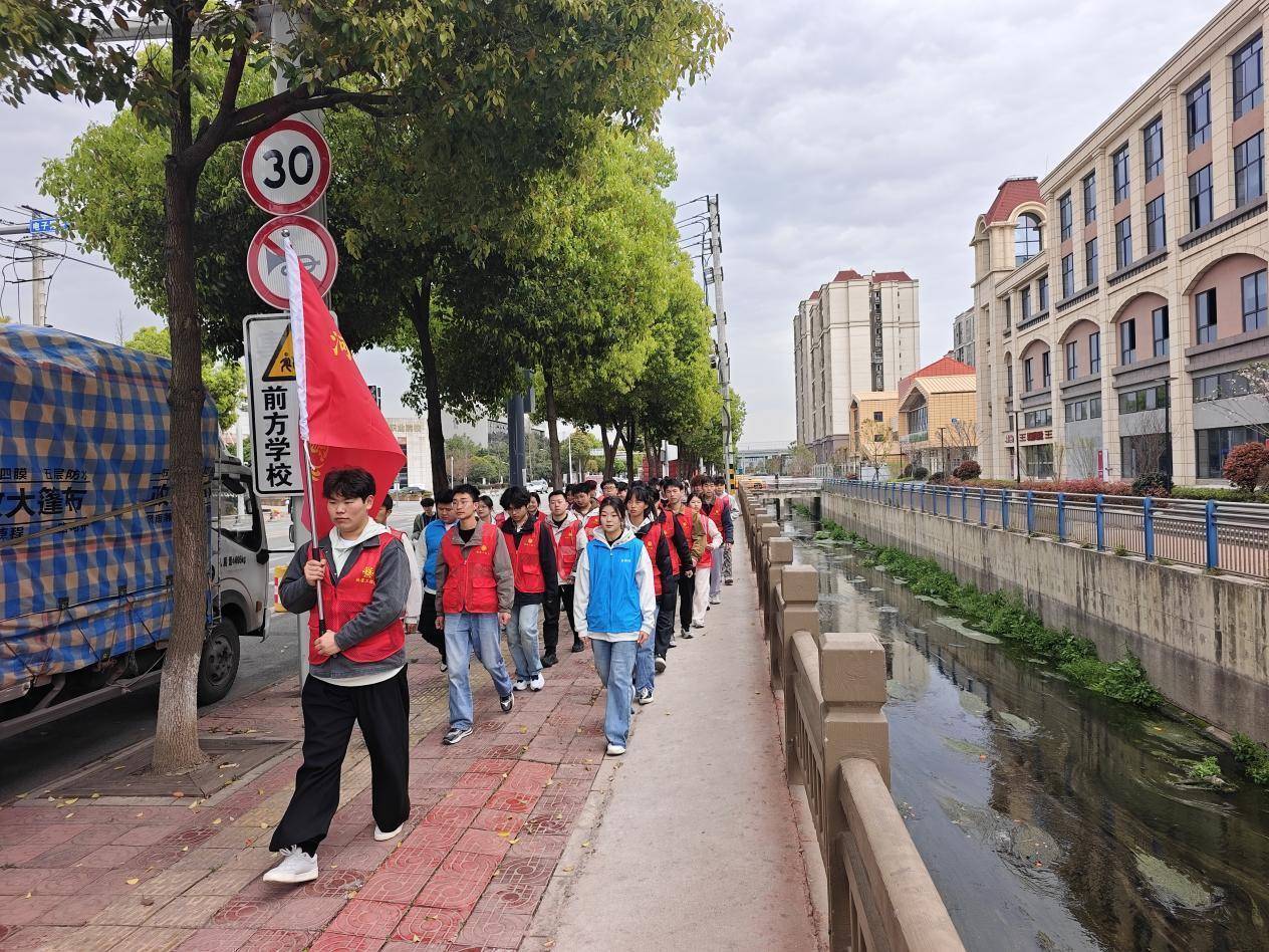 室内宣讲余温尚在,青春身影已奔赴河畔。在专业人员带领下,志愿者们来到永福渠,手持工具清理河岸垃圾,细致观察水质状况,认真记录环境信息。春风拂面、旗帜飘扬,青年志愿者们的身影成为河畔一道流动的风景线。