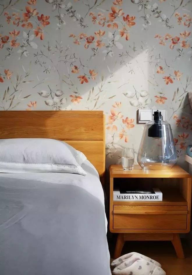 主卧装饰延续北欧风特色,不过在墙面设计上有所变化,采用清新的碎花壁纸装饰,原木风床头柜搭配灰色床品,十分和谐。