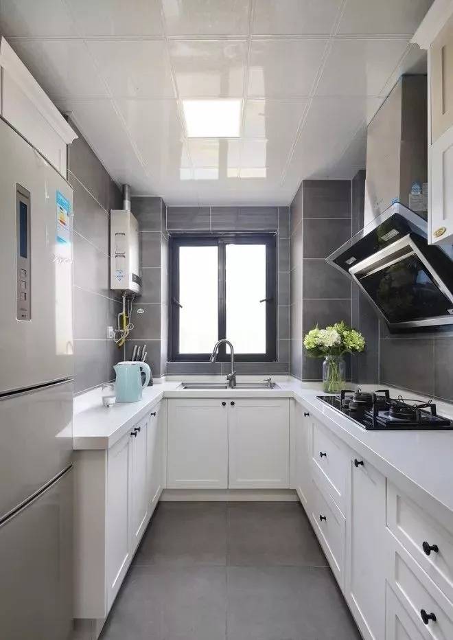 厨房与餐厅相连,是整个房子中面积较小的区域。地面和墙面均采用灰色大理石地砖铺贴,与白色橱柜搭配协调,关键是耐脏。
