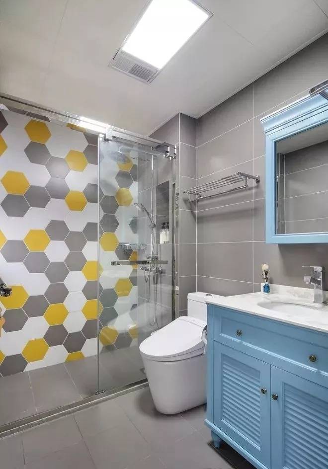 卫生间同样采用了与厨房相同的地板股票明天走势,厨卫一体确有其合理性。淋浴间墙面用六边形三色马赛克铺贴装饰,较为跳跃,搭配蓝色洗手台柜子,效果不错。